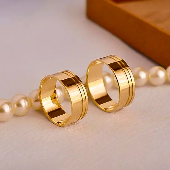 PAR DE ALIANÇAS DE OURO 18K RETA COM 2 FRISOS LATERAIS 7MM 10G